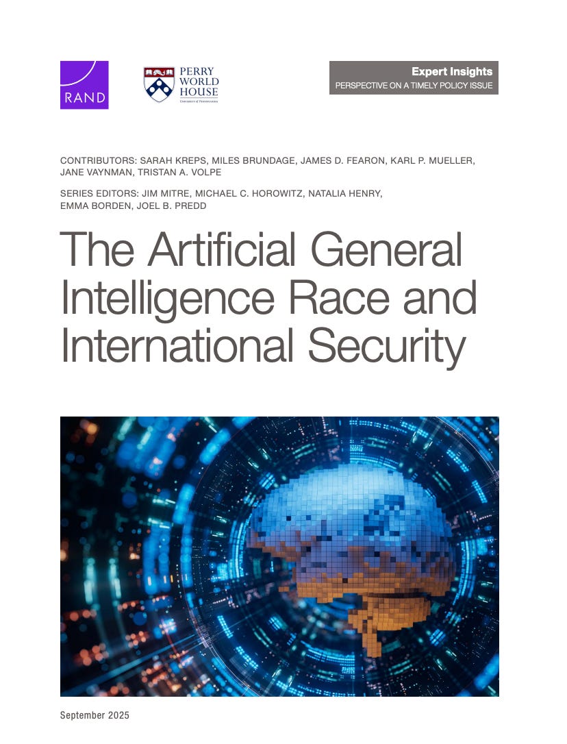 Second, just this morning, RAND and Perry World House published an edited volume that I contributed to, entitled “Artificial General Intelligence Race and International Security.” My paper in this volume helps explain why I think the topic discussed above (verification) is important.