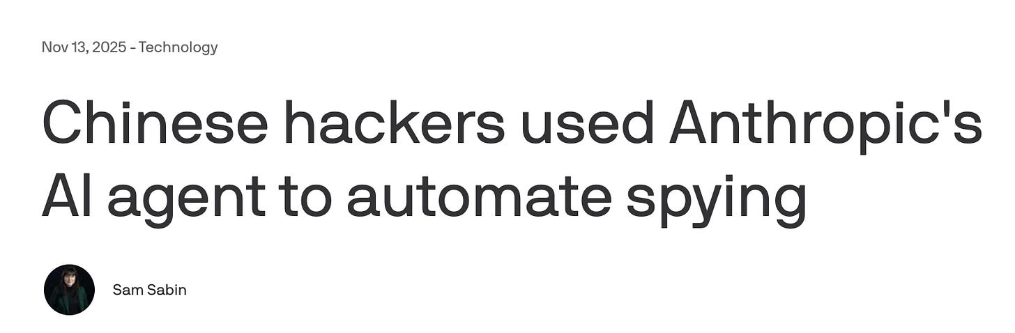Coverage from Axios of Anthropic’s report on Chinese hackers leveraging Claude Code. There are many such cases reported by OpenAI, Anthropic, and Google DeepMind, and notably, this is the tip of the iceberg in terms of real world AI misuse, today and in the near future. It seems extremely unlikely, given public reporting of safety culture at xAI, that they have robust protections against this kind of misuse, or potentially even more concerning misuse for creating biological weapons.